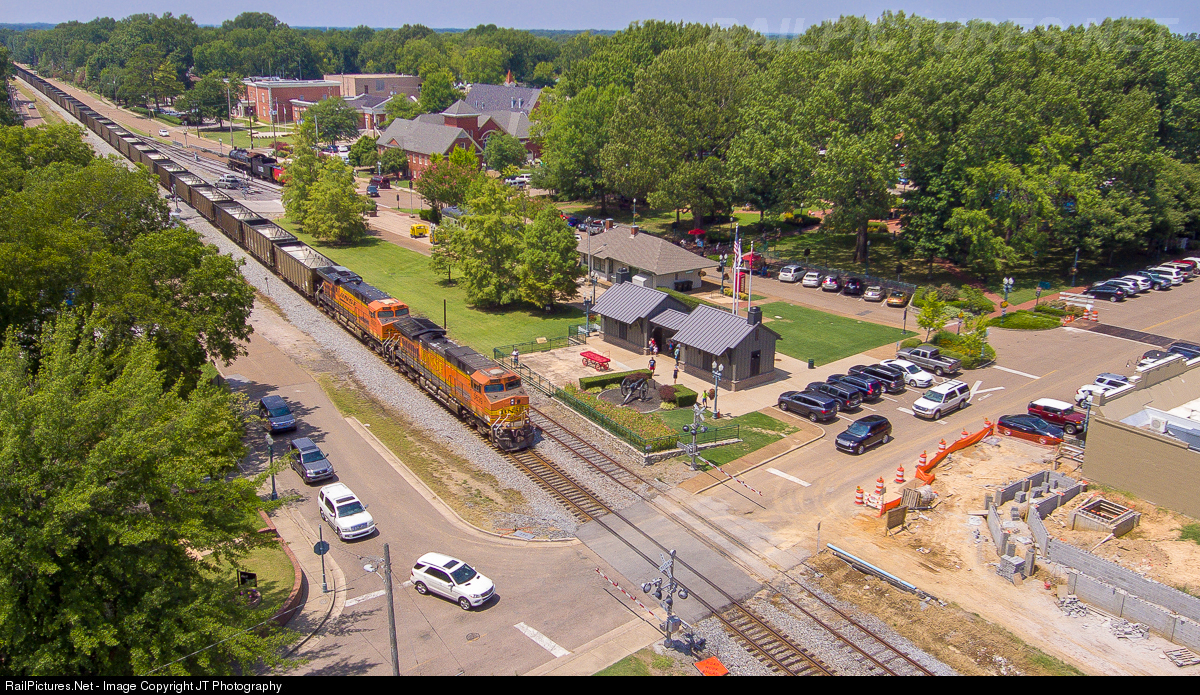 On Collierville's Train Heritage Day, a small crowd has gathered on the viewing platform to watch the DPU of an empty westbound coal train pass by. Collierville has started doing Train Heritage Day every August as a way to raise money for the cosmetic restoration of Frisco 1351 (in the far left). Events included tours of 1351, the Southern Railway Office Car (mostly obscured by trees), and a pair of speeders, along with a band and other displays at the Morton Museum of Collierville History.