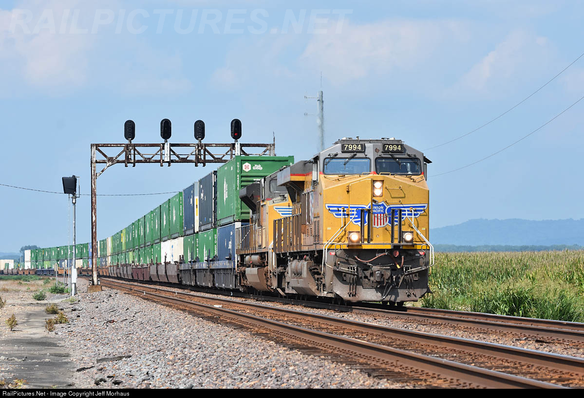 | UP 7994 leads a southbound stacktrain under a Missouri Pacific style signal bridge near McClure, Illinois on UP's Chester Subdivision.