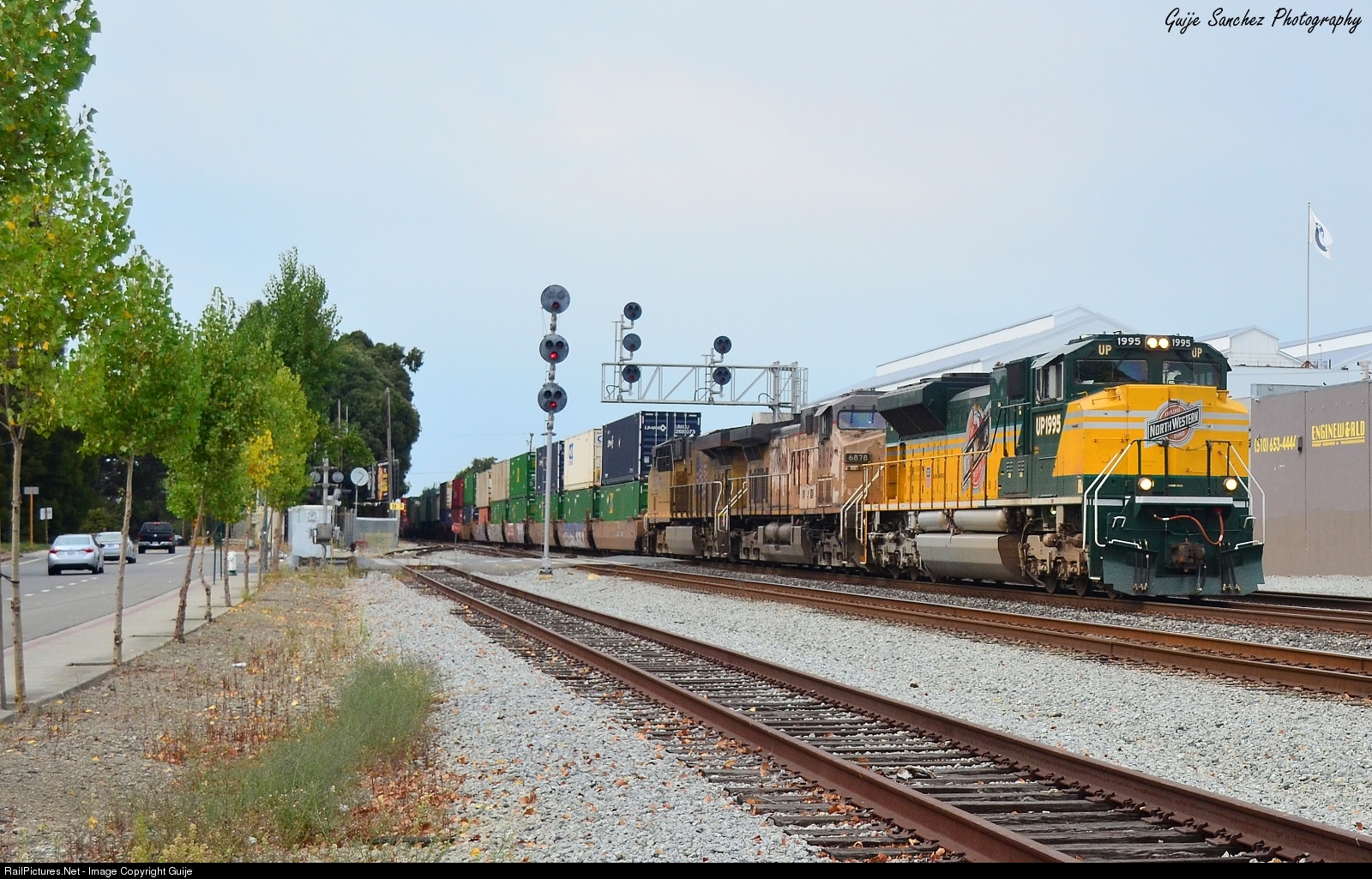 | UP 1995 leads an intermodal into Emeryville passing during a light rain, heavy skies shadowed in grey during an Autumn looking September evening.