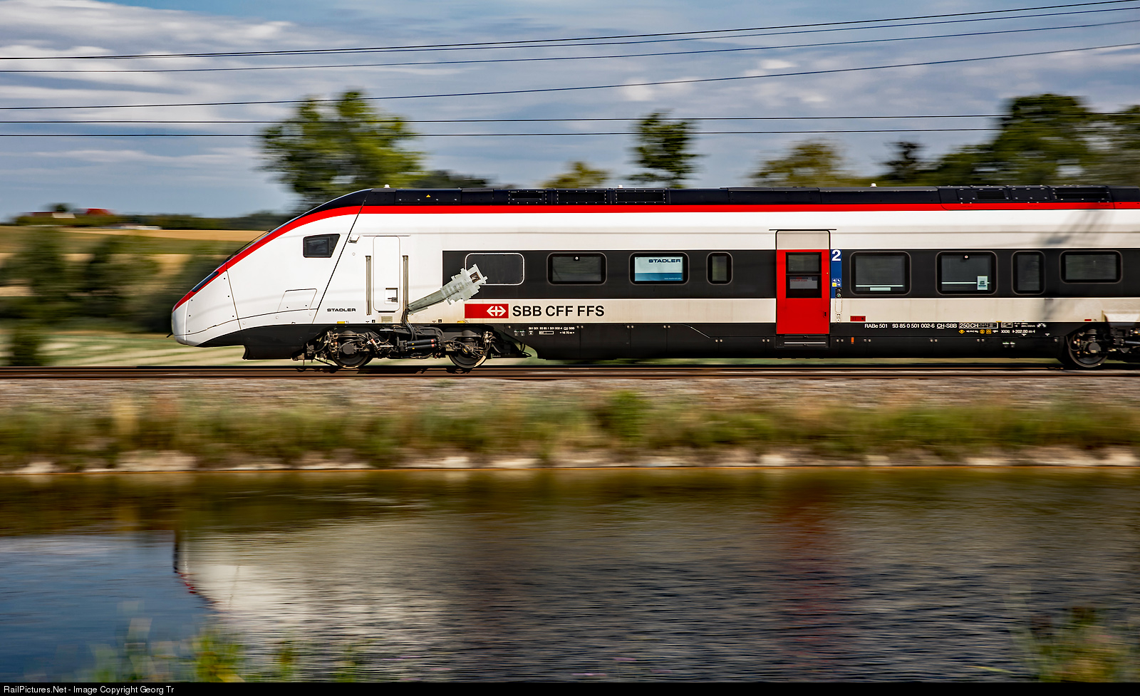 | Hand held 1/80 second pan shot of the "Giruno" highspeed train RABe 501 # 002 running with more then 100 km/h along the pond at Riedt near Erlen. There are clearly visible cables coming from the first bogie and going into the first window, which was replaced by a wooden black painted covering. This train will make several test runs in Germany in the next days and before, the train is checked on the Thurtal main line of the SBB between Sulgen and Romanshorn. |