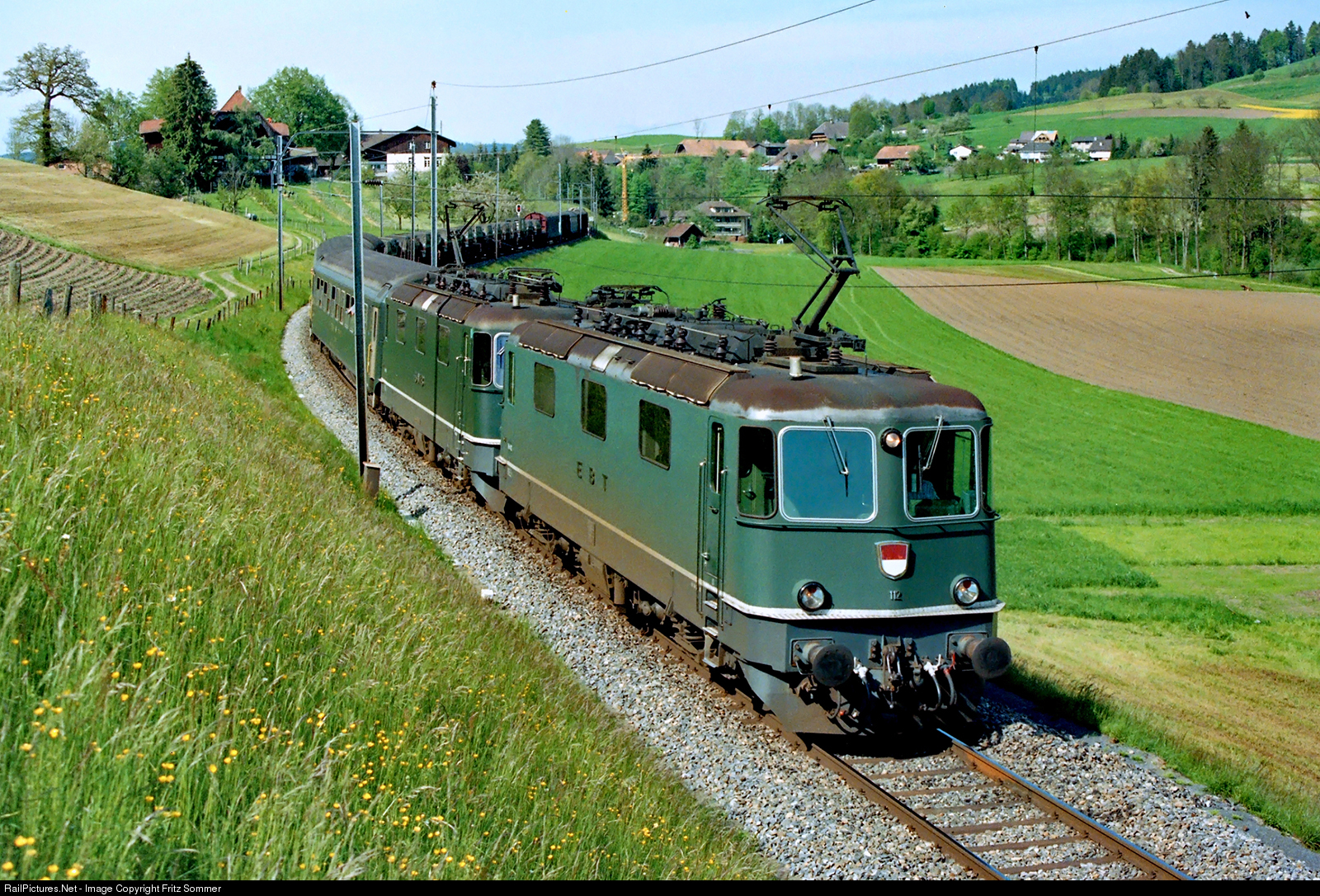 | On 25 May 1991, the locomotives Re 4/4 III 112 (EBT) and 141 (VHB) are moving the Saturday freight train # 980 towards Thun, recorded between Konolfingen and Oberdiessbach. On this day, the train consists mainly of military cargo.