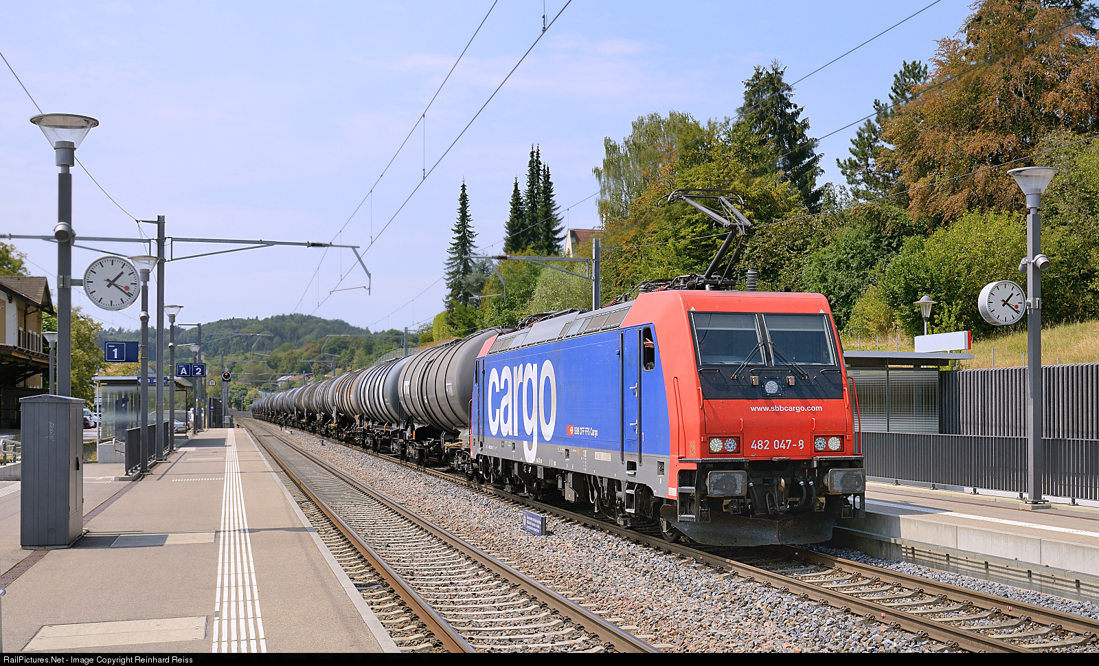 | SBB Cargo 482 047 (rented to Widmer Rail Services AG) heads a rake of empty tank waggons from Rümlang (Switzerland) to Ingolstadt (Germany) just passing Jestetten station. |
