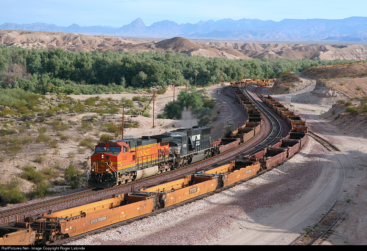 | BNSF C44-9W 5268, NS SD60I 6730 leading a westbound tabletop train at Topock, Arizona. |
