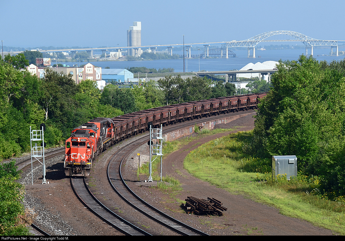 After dumping their train at CN dock 6, IC 6253 prepares to make the run up Proctor hill and back to the yard with the empties. In the background is the John A. Blatnik bridge which carries Interstate 535 and U.S. Highway 53 over the Saint Louis Bay between Duluth, Minnesota, and Superior, Wisconsin and underneath that bridge is the remains of the Interstate Bridge which was the first bridge to cross the harbor and bay between Duluth and Superior. The Duluth-Superior Bridge Company, funded by the Great Northern Railway, was formed in 1894 to build a bridge connecting Connors Point in Wisconsin to Rice's Point in Minnesota. The bridge was dedicated in April of 1897.