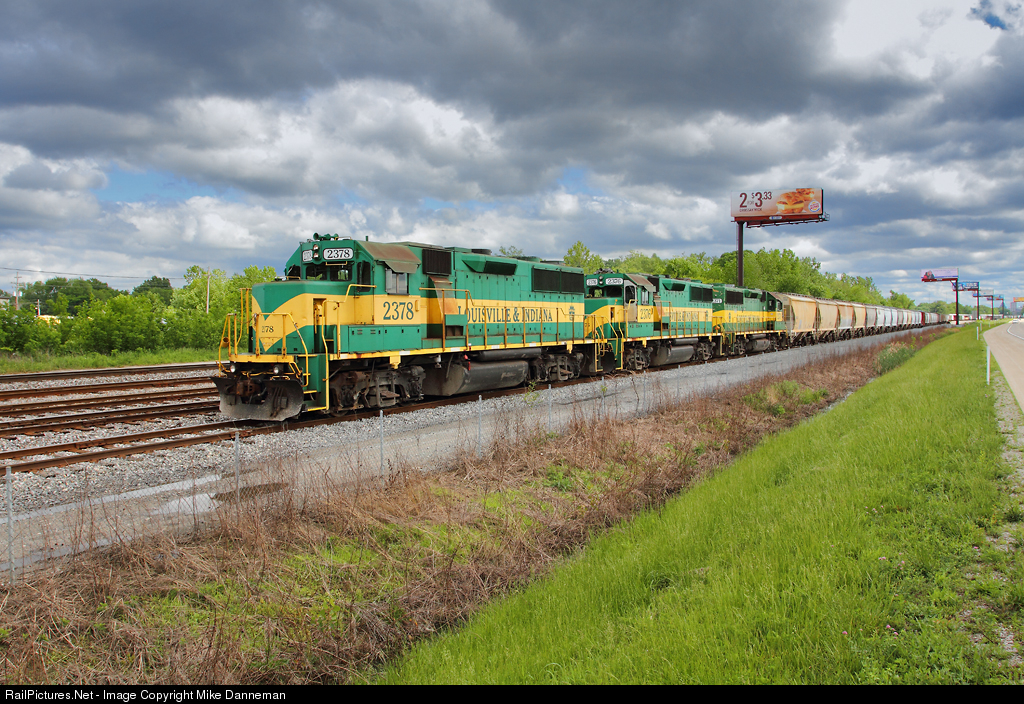 | Louisville and Indiana EMD GP39-2 No. 2378 leads a freight slowly out of Jeff yard at Jeffersonville, Indiana, on May 15, 2014. |
