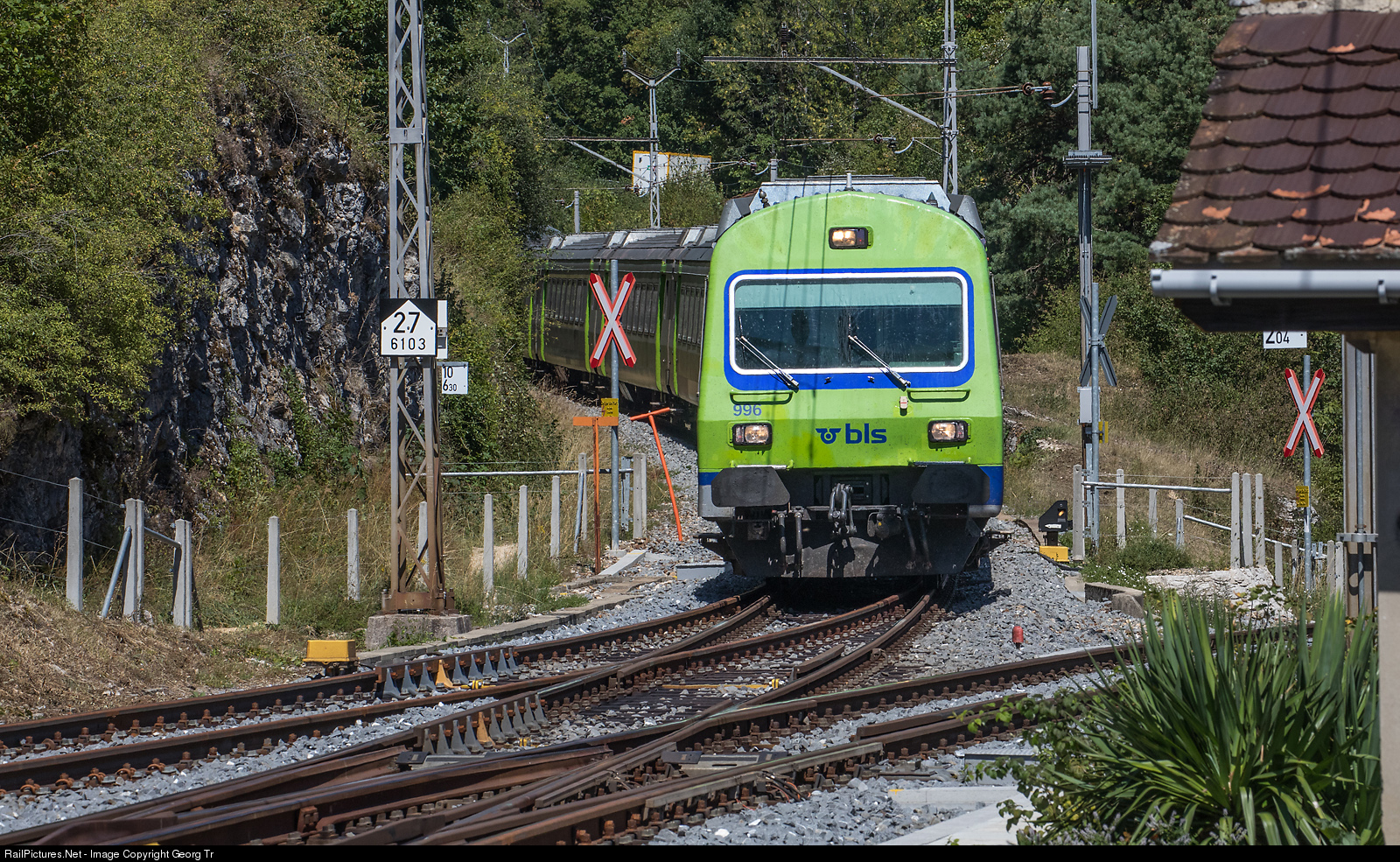 | Push pull train of the BLS, with former SBB standard cars type III and leading cab car Bt # 996, is entering Chambrelien switchback station. In the rear of the train is Re 465 # 003. The train is running the Regio Express 3927 from La Chaux-de-Fonds via Neuchâtel-Kerzers to Bern. |