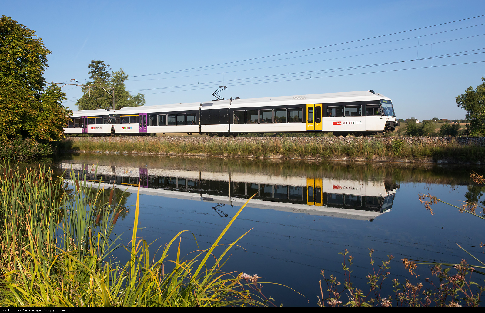 | Articulated lowfloor "GTW" trains of the first generation of Thurbo, RABe 526 # 685 and # 684 in multiple traction are running the S 7 service 23733 from Weinfelden via Romanshorn to Rorschach, along the pond at Riedt near Erlen. Thurbo has 10 of this vehicles which were built 1998-1999 by Stadler Bussnang. |