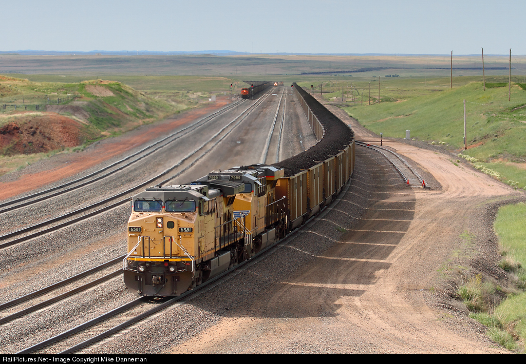 The four mainline tracks over Logan Hill in Wyoming’s Powder River Basin can still be very busy at times. On June 23, 2018, five trains can be seen between the top of the hill and Bill to the south. On Track 1 is a southbound BNSF coal load. Coming up alongside on Track 2 is a Union Pacific coal empty headed north to load at one of the many mines. Just visible and about to disappear down the grade is the DPU of a UP coal train on Track 3. Cruising by on Track 4 is a loaded UP coal train speeding up after cresting the hill. In the background is another UP coal empty that is following the UP train on Track 2. A busy morning on the Orin Line!