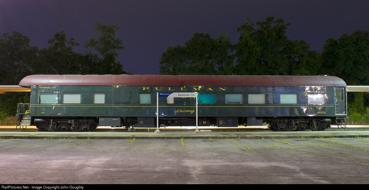 | Georgia Railroad Dearing sits on a spur track at the Amtrak Station in Savannah. A light rain is beginning to fall on this beautiful Pullman passenger car as a distant thunderstorm approaches from the west. |