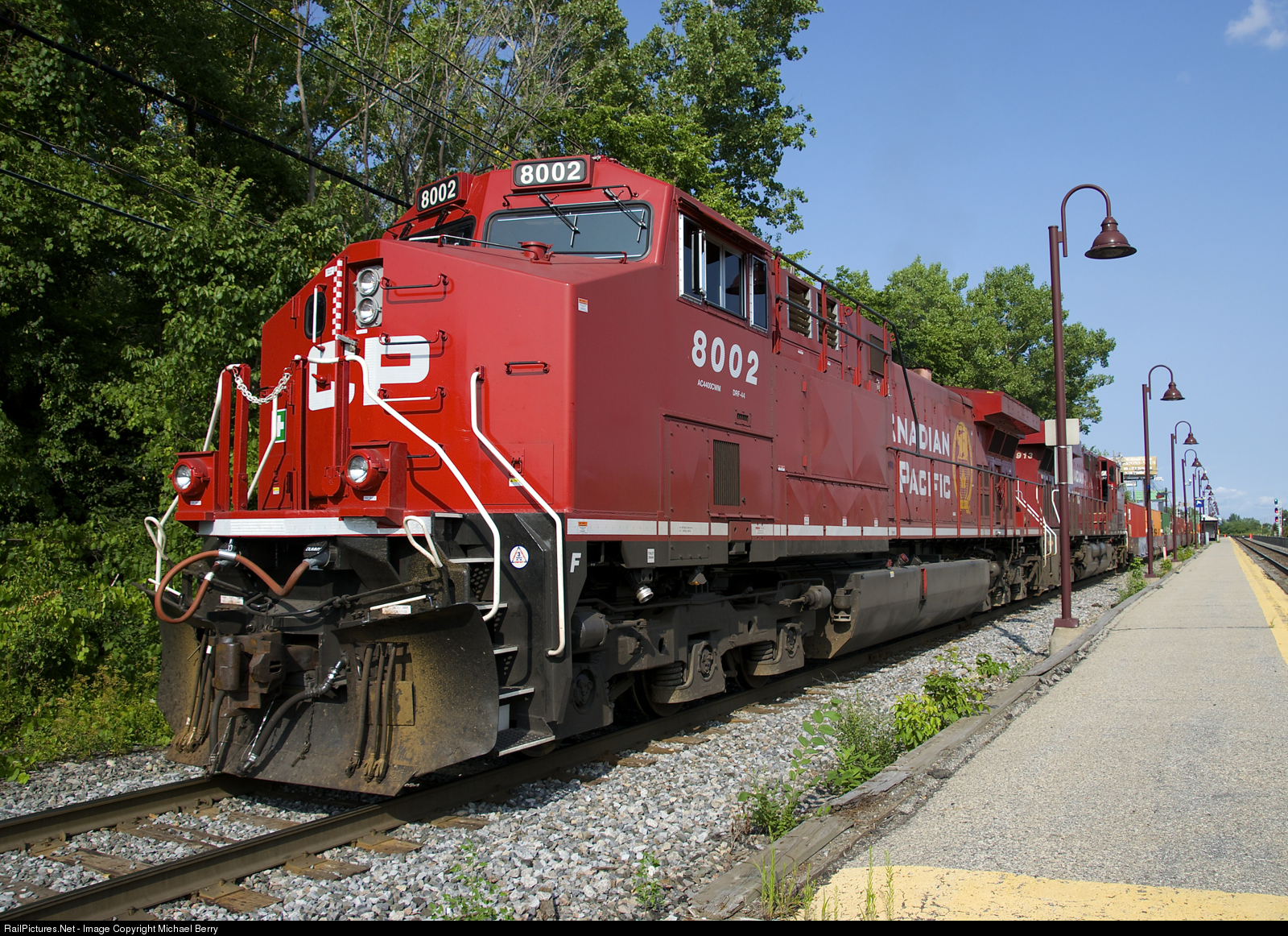 | They look great when they're fresh. CP 8002 (recently rebuilt from AC4400CW CP 9507) looks great as it leads CP 143, with CP 8913 trailing. The train is stopped by the Lachine station platforms before backing up, as it continues to put its train together before heading west. |