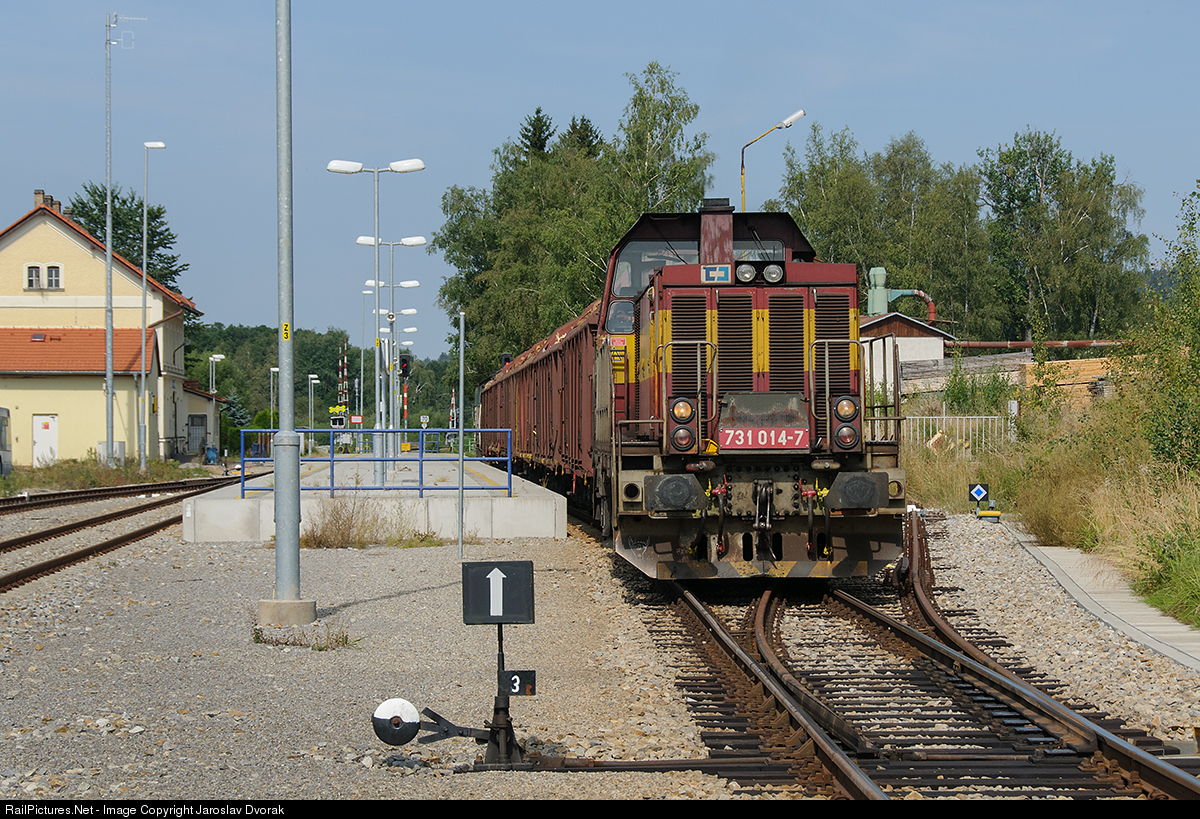 | Freight train Pn 58412 headed by locomotive CD 731 014-7 captured at the Cerna station in Posumavi - Hurka. The train carries wood from Nova Pec to Ceské Budejovice.