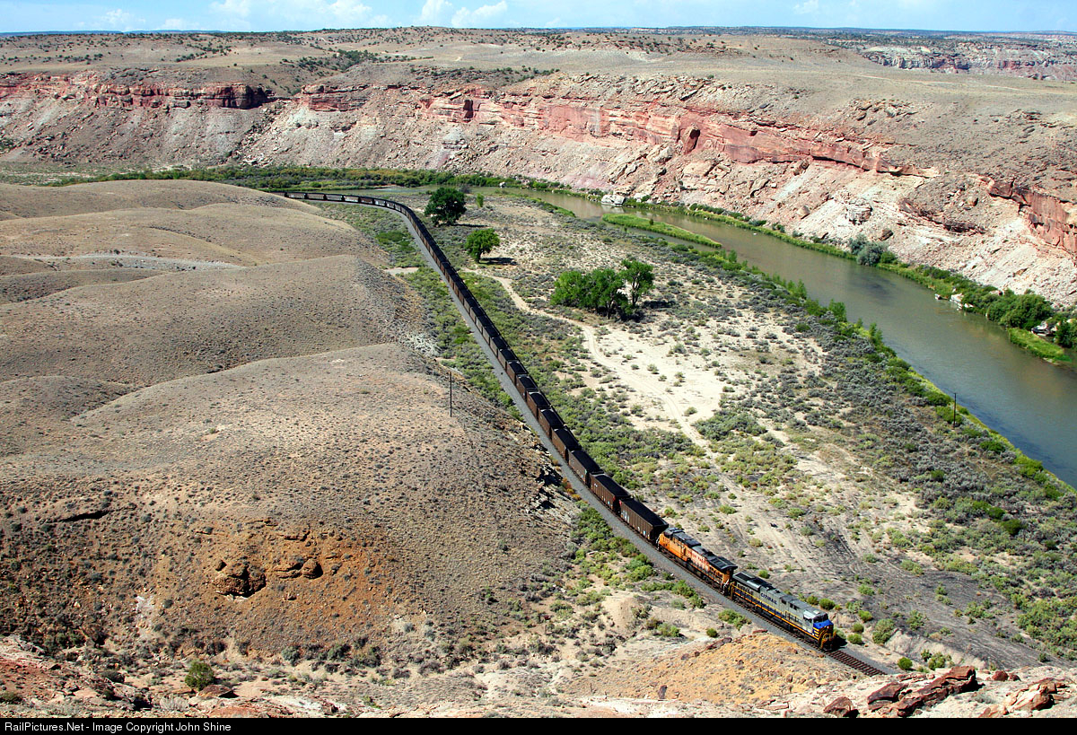 CREX #1328 leads this Union Pacific loaded coal train Westbound on the North Fork Branch at Milepost #42. It is following along the Gunnison River.