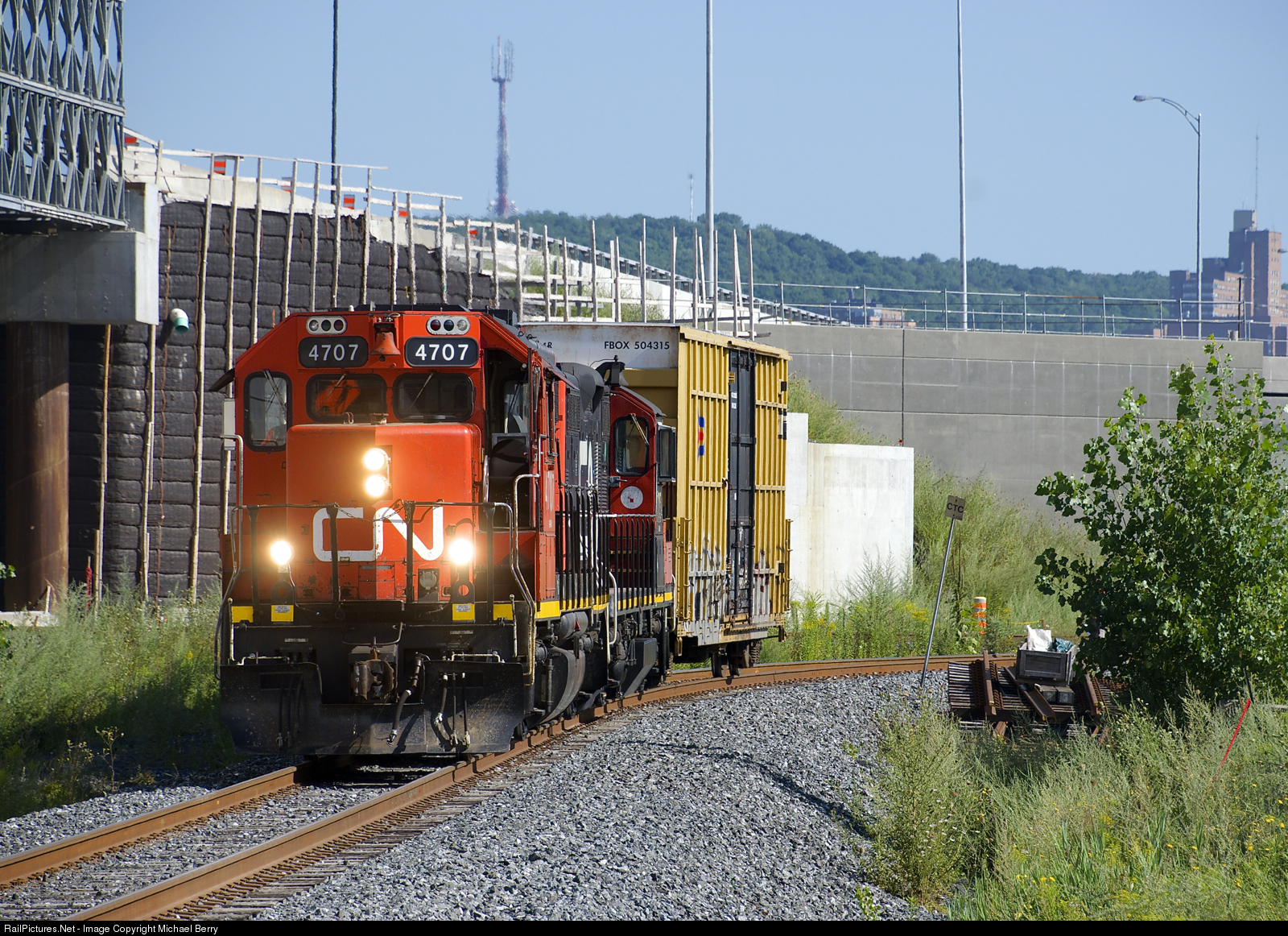 | With a single boxcar for the Kruger plant, the Pointe St-Charles Switcher with CN 4707 & CN 7054 for power is stopped near the Notre-Dame crossing on the rarely used Turcot Holding Spur, waiting for a crewmember to walk up to the power after throwing the switch. |