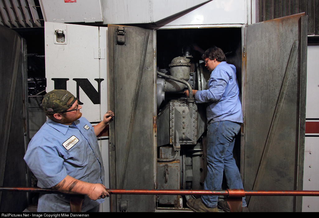 Jeremy Holyoak and Garrett Pitner from the mechanical department of the Copper Basin Railway work on EMD GP39-2 No. 502 at Hayden, Arizona, on April 20, 2017. This former Kennecott Copper locomotive is having its 360 day (annual) inspection done at the railroad’s well-equipped Hayden Shop.
