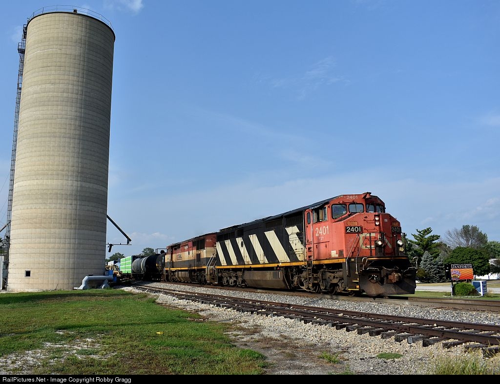 CN C40-8M 2401 leads M399 south past the grain elevator in Danforth.