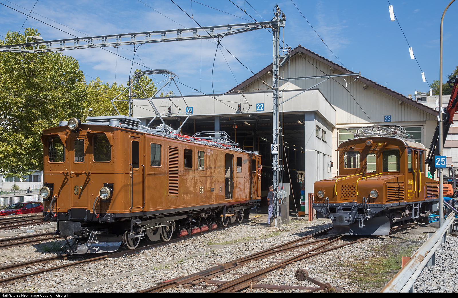 Meeting of two old vehicles of the former Berninabahn, now Rhaetian Railway, in Vevey today. Ge 4/4 # 81 of the Blonay-Chamby Railroad Museum, operational again since a few days, built in 1916 by SLM and BBC as Ge 6/6 # 81, was later Ge 4/4 # 181 and came to the Blonay-Chamby in 1970, after withdrawal by the RhB in 1965. On the right Ge 2/2 # 161 of the RhB, built in 1911 by SIG and Alioth as Ge 2/2 # 61 for the then independent Bernina Railway. This locomotive was used as trailing vehicle for heavy trains or for shunting. This day, the # 161 arrived on a road lowfloor trailer from Landquart, as guest locomotive for the MEGA BERNINA festival on the Blonay-Chamby in september.