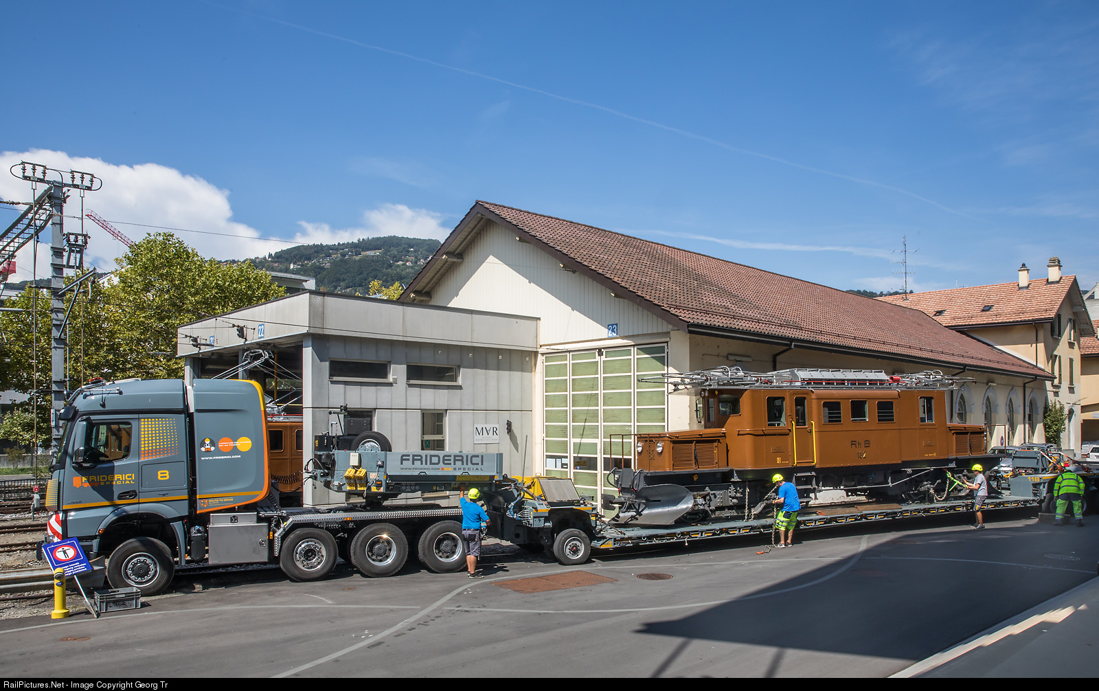 | "Bernina Crocodile" Ge 4/4 # 182 of the RhB arrived by road transport from Landquart at Vevey, for a visit on the Blonay-Chamby Railroad Museum during the MEGA BERNINA festival in september 2018. Preparations for the unloading of the 42 ton locomotive from the special Friderici low-loader vehicle beside the shed at Vevey. |