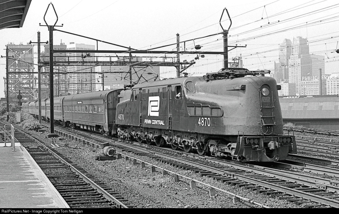 For decades, the PRR end of the Northeast Corridor meant a steady parade of GG1-powered trains. Here Penn Central 4870 has just left Newark on its way to Penn Station, as seen from the platform of the PATH station in Harrison, NJ. Downtown Newark is in the background.