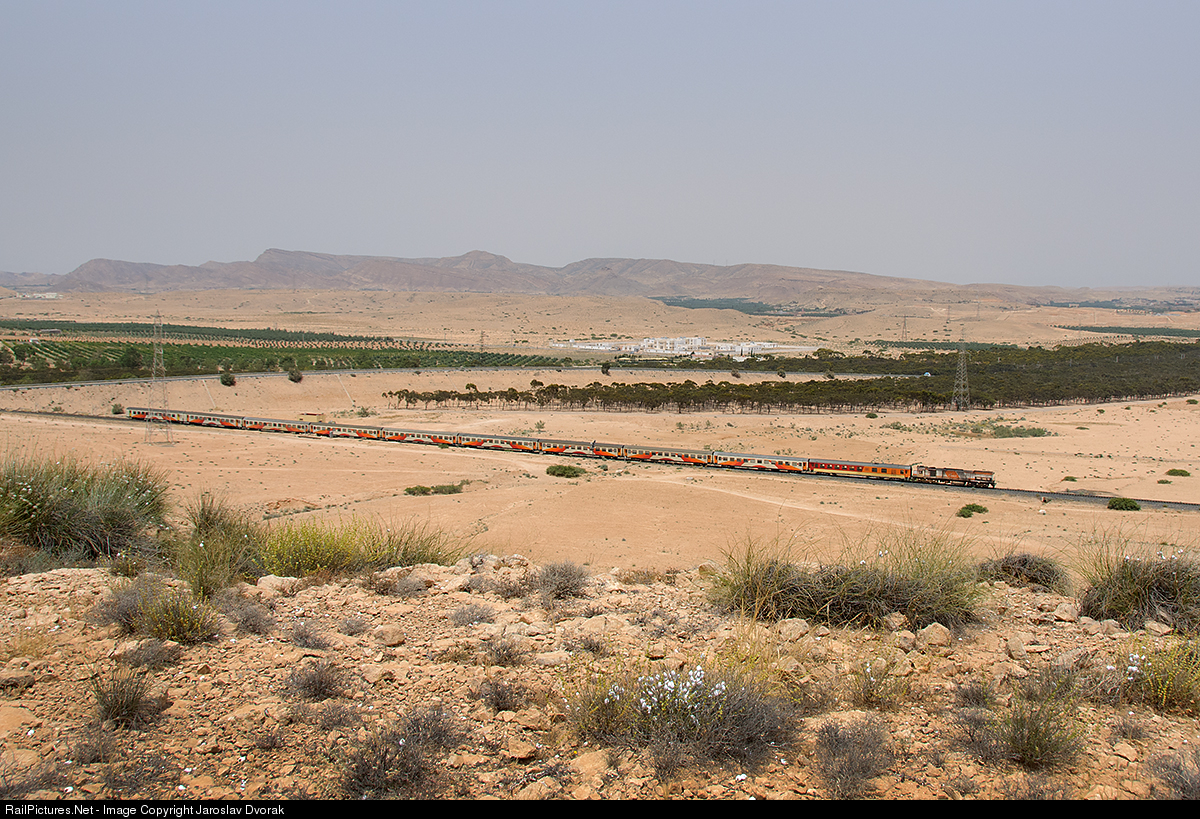 The personal train on the front with the ONCF DH 429 locomotive is captured as it passes through the pristine landscape around Taourirt.