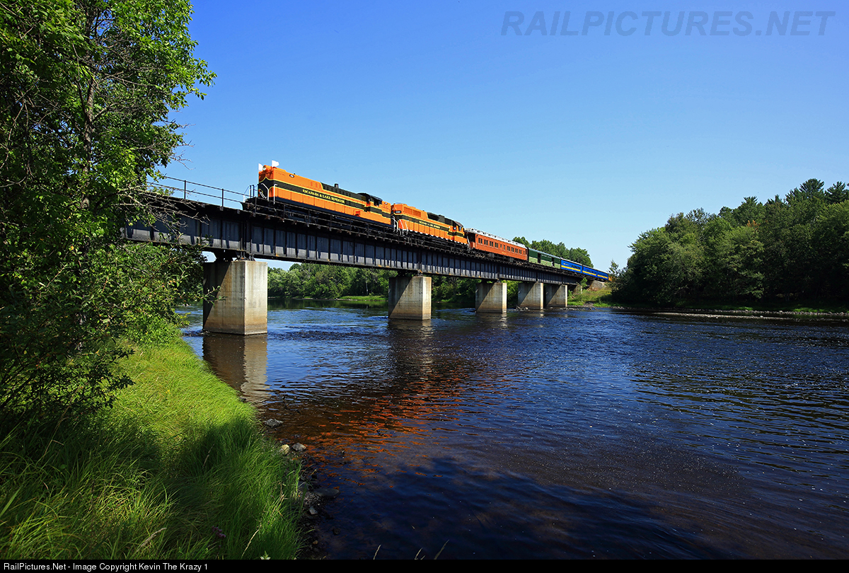 | Built in 1953, the Baldwin RS-12 #300 leads the Escanaba & Lake Superior's business train into the state of Wisconsin as it crosses the Menominee River. The train will get onto home rails at Pembine and continue north to Mass City, then return to Wells the following day. |