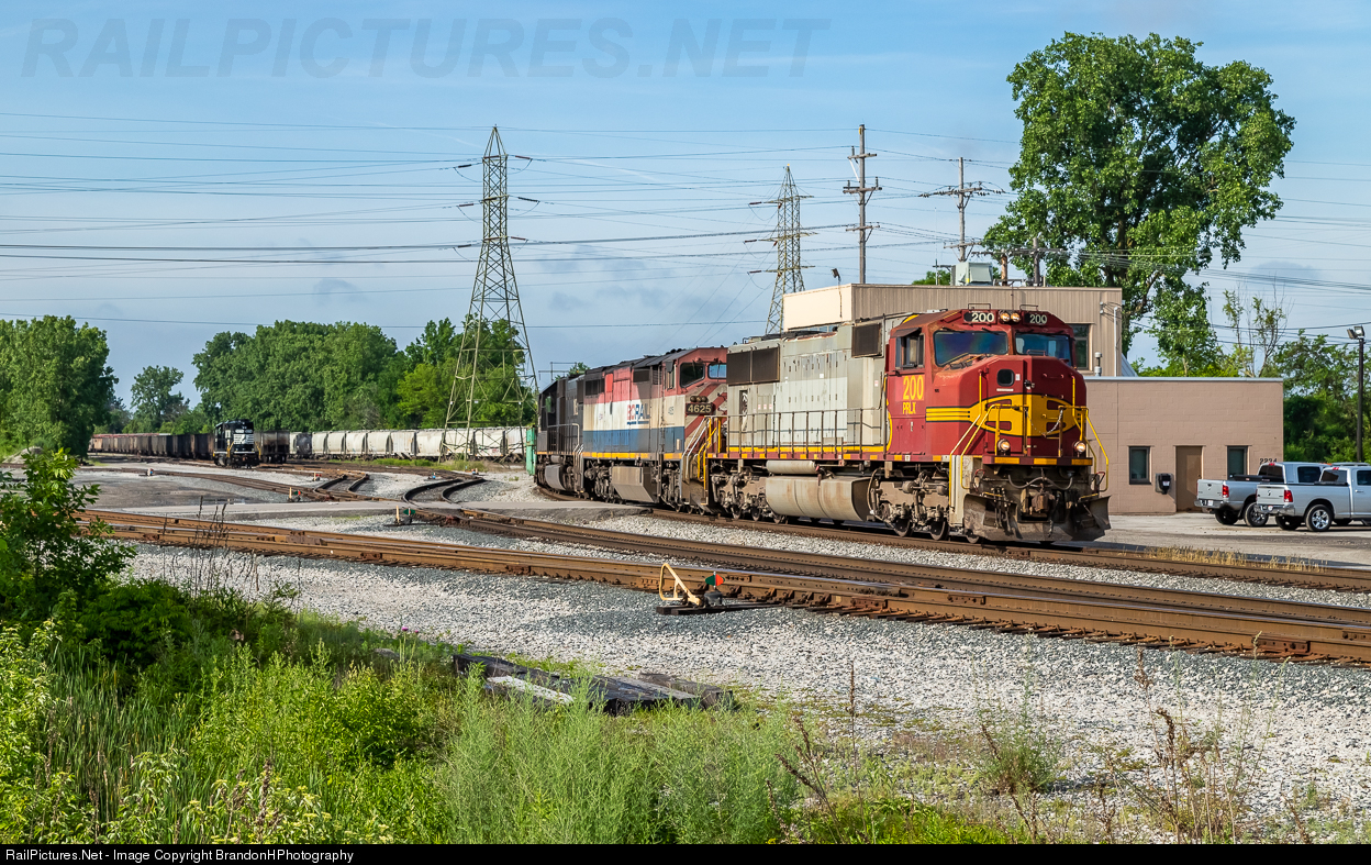 | No GE's Here, almost no NS either. PRLX 200 formerly a BNSF/ATSF SD75M on lease to CN with two rather rare units trailing a BCOL Barn and a IC SD70, pulls passed the Sandusky Yard Office for a crew change to take 13Q on into Elkhart. |
