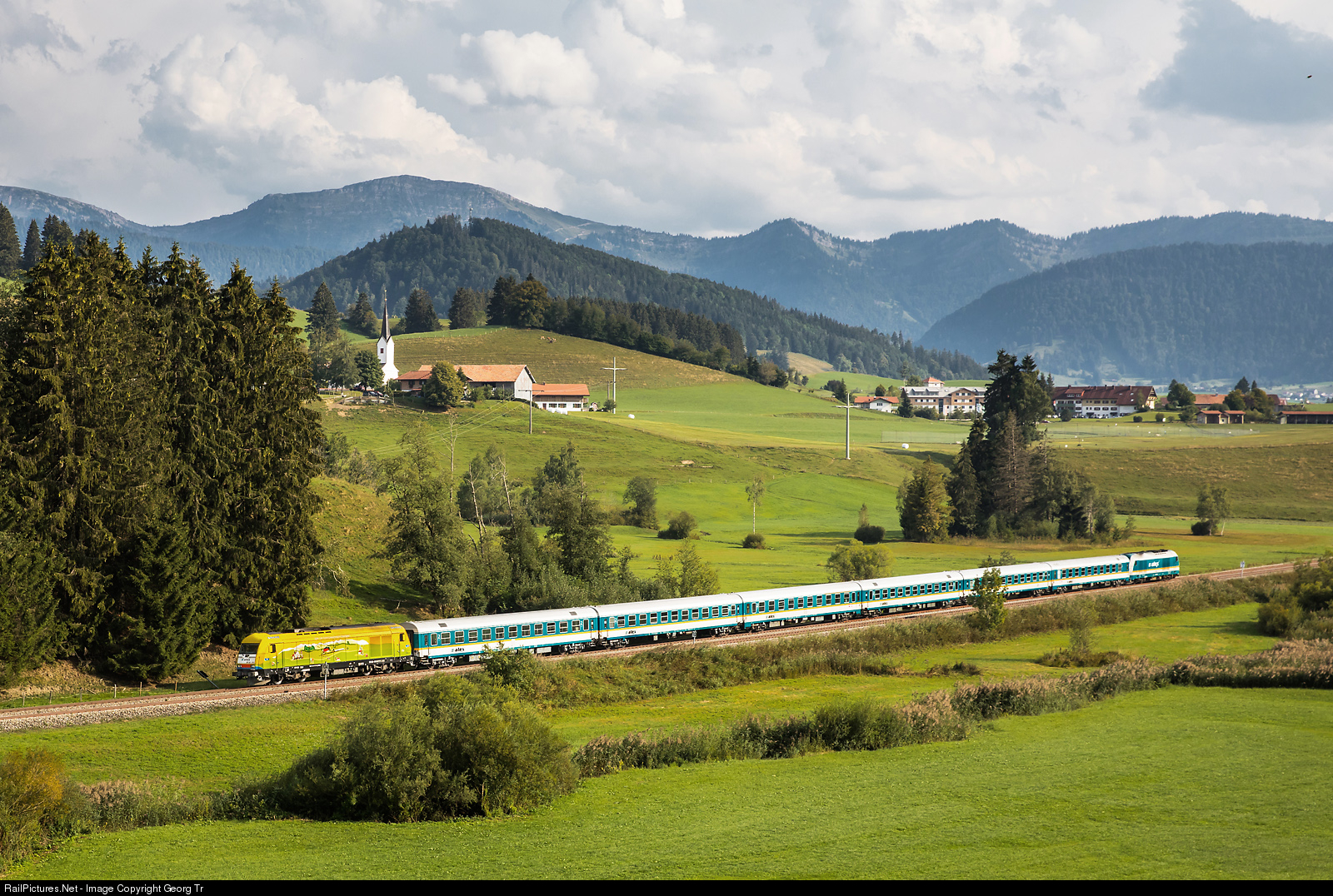 Diesellocomotive Siemens "Eurorunner" ER 20 # 013 of Beacon Rail, built in 2006 and rented to "Die Länderbahn GmbH DLB, Viechtach" since december 2017, is pulling the "ALEX" train ALX 84140 from München Hauptbahnhof to Lindau, near Wolfsried north of Oberstaufen. In the background the church of the small village Zell. The ER 20 # 013 has a publicity paint scheme for "bodo", the Bodensee-Oberschwaben Verkehrsverbund, since december 2017. In the rear is another Eurorunner locomotive.