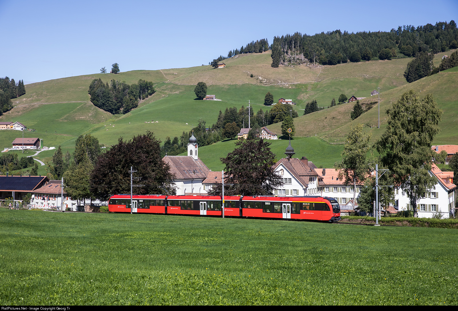 | Brand new "Walzer" ABe 4/12 # 1001 from StadlerRail for the Appenzeller Bahnen is running the S 23 service 1109 from Gossau via Herisau-Urnäsch-Appenzell to Wasserauen, passing the "Leiden Christi" monastery at Jakobsbad. |