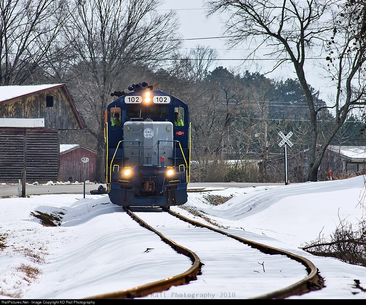 | As the sun peak through the cloud on this bitter cold early afternoon. G&W-Chattooga & Chickamauga Railway (CCKY) Train 702 is making its way north through Rock Springs, GA on the former Central Of Georgia CR&S right of way heading for Chickamauga, GA to drop all three cars off at the CCKY Yard in Chickamauga. |