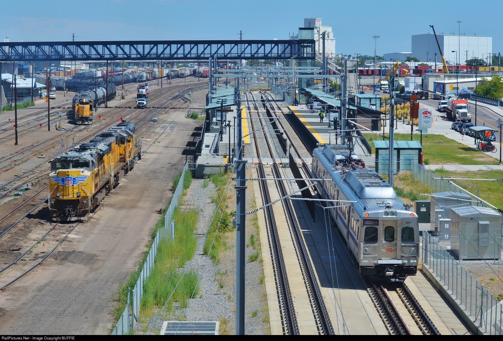 UP 8467 (SD70ACe) holds station in the 36th Street Yard as the light power builds a train. On the right is the 'Train to the Plane', a commuter rail line that runs from Denver International Airport to the Denver's Union Station downtown. This is one of the many stops in between, and is in the Rhino district north of downtown Denver.