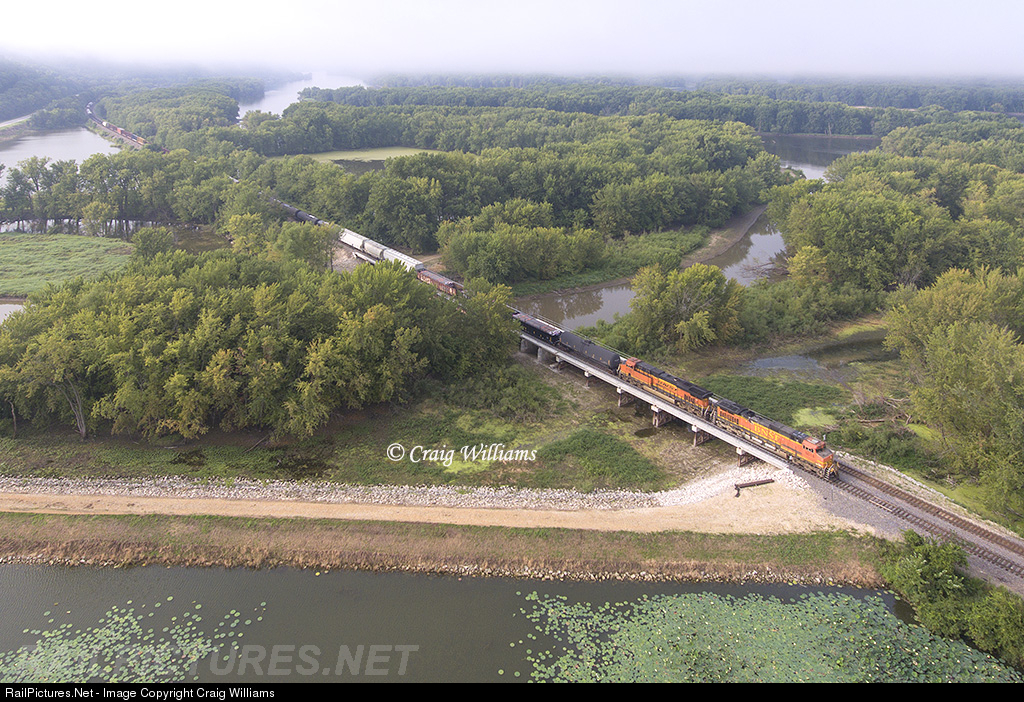 A Galesburg, IL, to Northtown Yard in Minneapolis, MN, freight train rolls along the humid and foggy Mississippi River this mid-morning. The train is crossing the Bad Axle River near the Genoa Fish Hatchery roughly 22 miles from the next crew change at La Crosse, WI. The road in the foreground is used by the fish hatchery for access to their water pools.