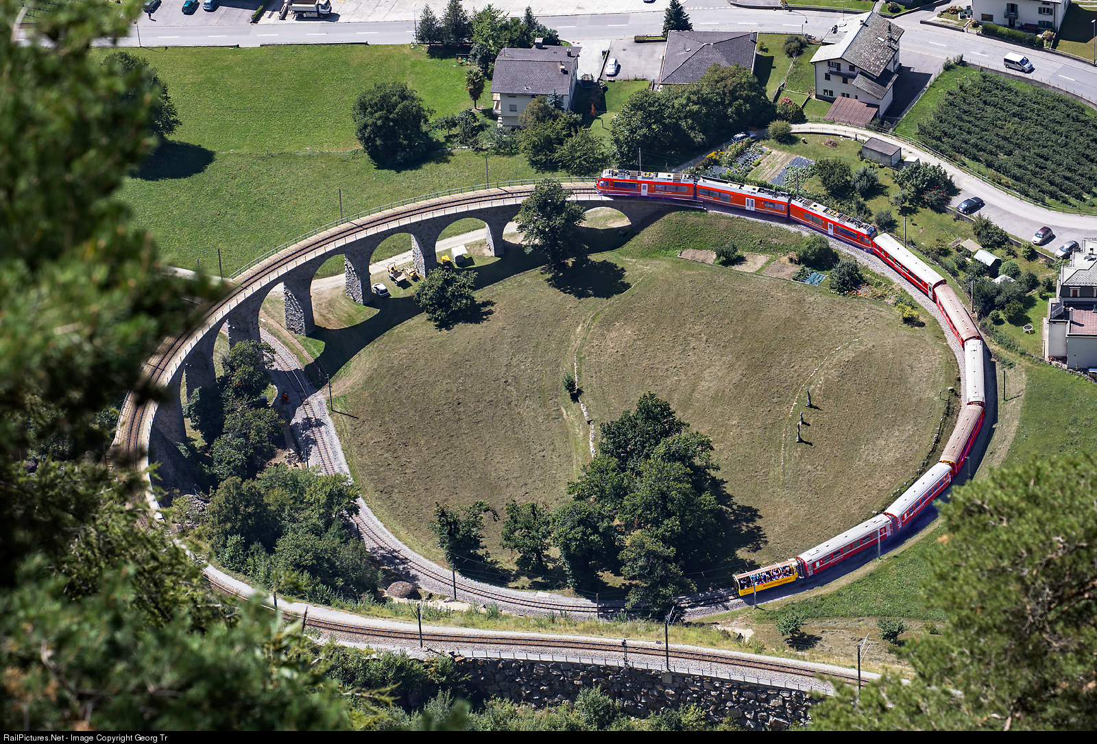 Spectacular view of the 148 meter long spiral viaduct of Brusio, which is currently being rounded by train 1652 from Tirano to St.Moritz. At the end of the train is an open observation car, the "excellent class" on this sunny day.. The Brusio spiral viaduct with a radius of 70 metres and a continuous gradient of 7% was built from 1907 to 1908 for the then independent Bernina Railway and is now part of the Albula-Bernina UNESCO World Heritage Site.