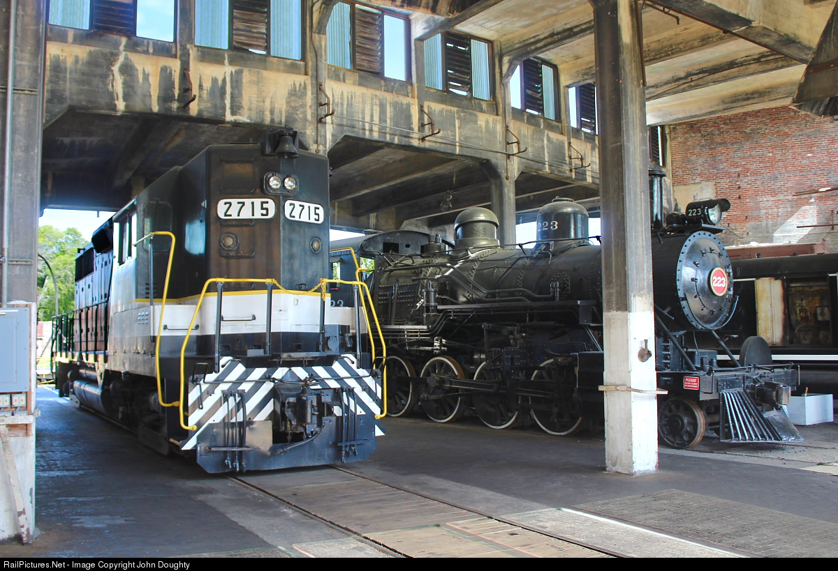 The early morning greats Savannah and Atlanta GP-35 2715 and steam engine 223 in the Georgia State Railroad Museum roundhouse.