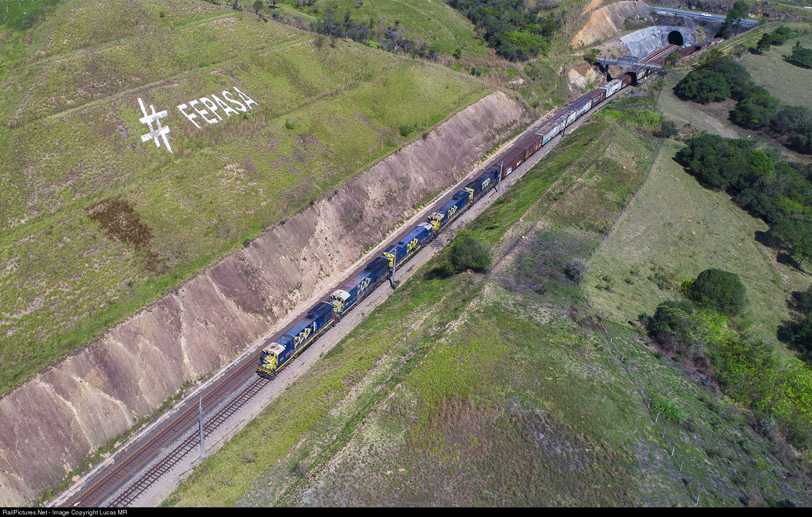 When the Fepasa Railroad built the new line in 1989, they have placed two large logos in two visible points, near highways. This one is located at Itu city, at D. Catarina yard. The Fepasa Railroad don't exist anymore, since it was privatized in 1998. A group of volunteers, recently restored the historic logo, located near the Castello Branco highway, as can be seen in the photo, while a northbound MRS train heads to Itu city.