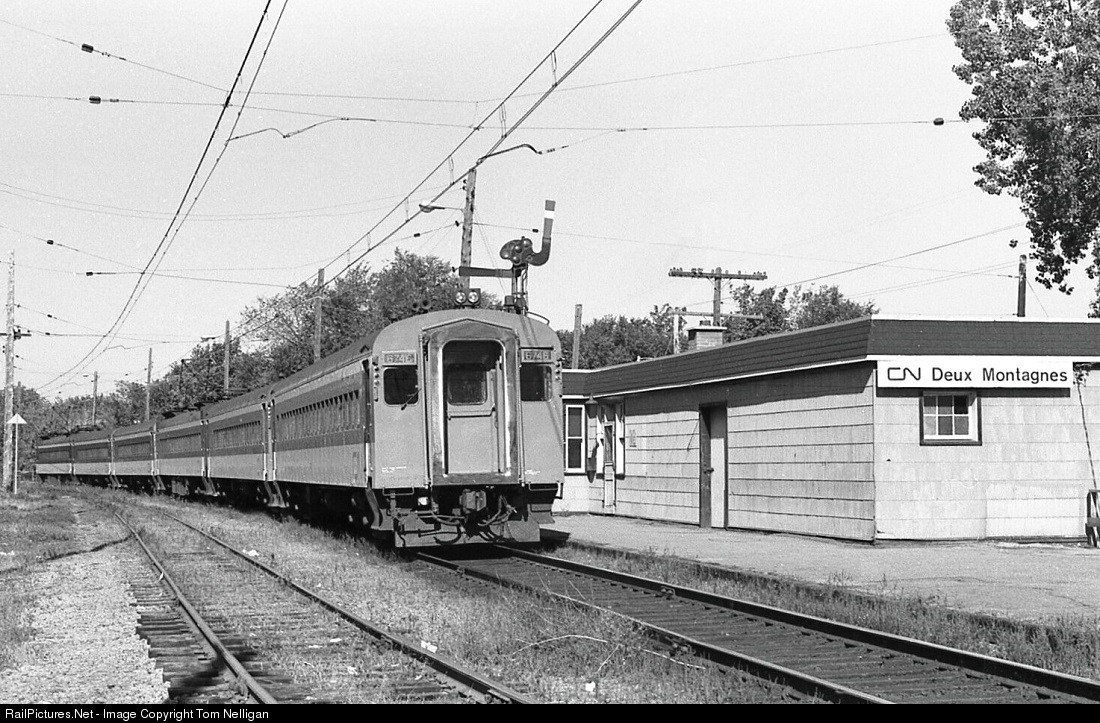 A six-car set of Canadian National MUs lays over at Deux Montangnes, Quebec, the end of CN's 17-mile-long suburban electric zone, before returning to downtown Montreal. CN bought 18 of these DC-powered cars from Canadian Car & Foundry in 1952.