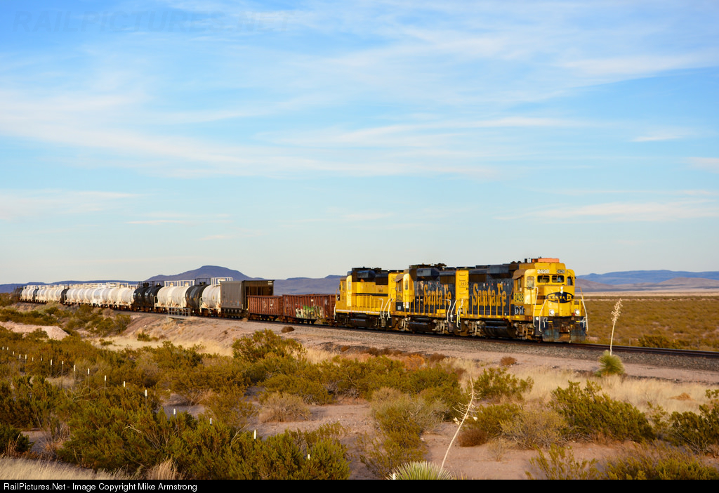 | Santa Fe Lives On in the Desert: For a period, the Southwestern Railroad in southern New Mexico utilized a fleet of ex Santa Fe GP30 locomotives to haul freight, a few of which even kept their Santa Fe paint. Here, we see a trio of GP30s leading a freight toward Deming on a winter afternoon. |