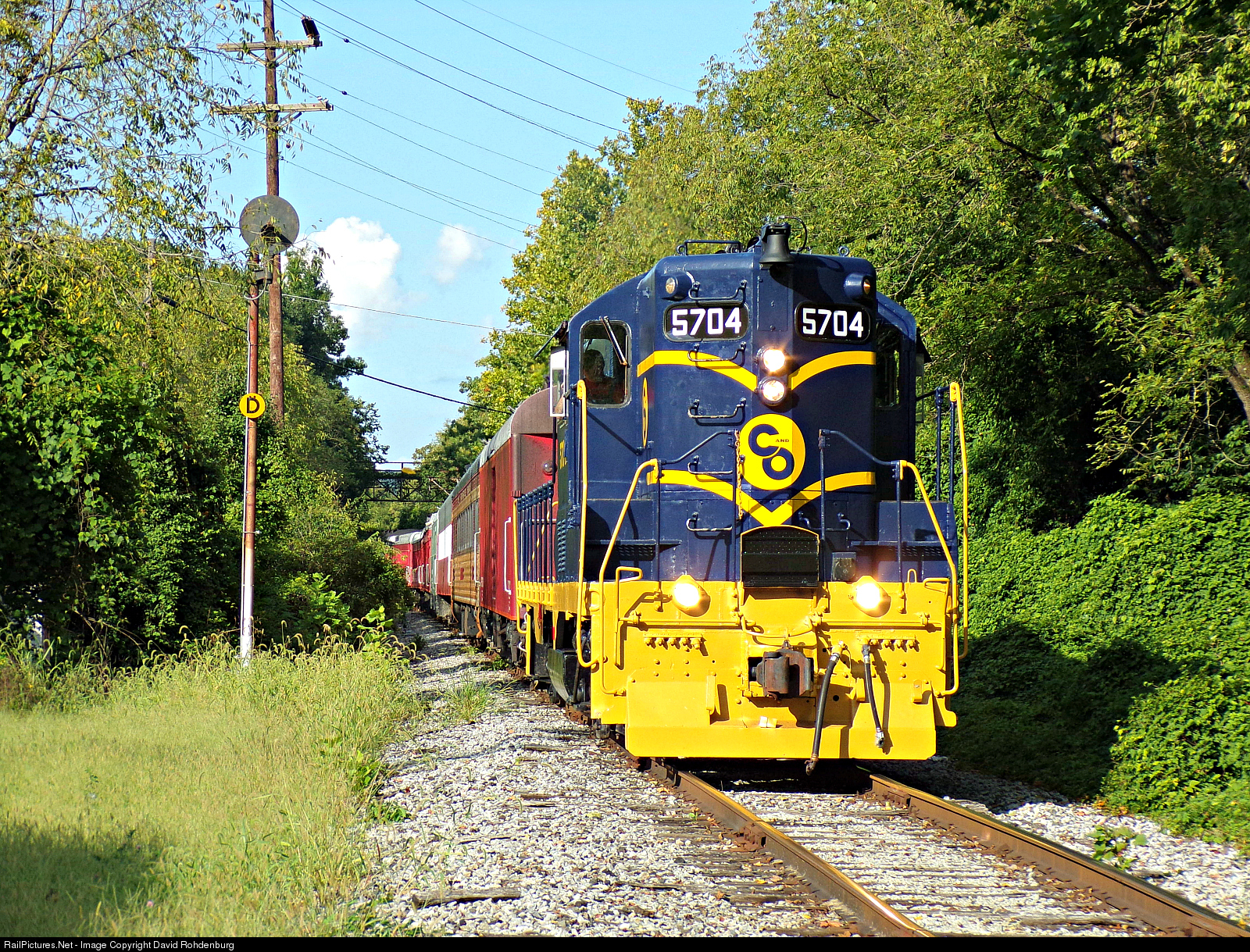 On September 2, 2018, the Cincinnati Scenic Railway, operators of the Lebanon Mason & Monroe Railroad and the Ohio Rail Experience, unveiled the completion of their latest project: the restoration to As Delivered, Factory colors of former Chesapeake & Ohio GP7 5704. After serving as number 55 for the Indiana & Ohio Railway, and later for the LM&M since her retirement from the Chessie System in the 1980's, the 5704 is the oldest former C&O GP7 still in active service, and is also the oldest continuously active GP7 in the United States, having been completed by EMD in May of 1950. The work was completed by volunteers on the CSR staff over several weeks in July and August. Here, she powers the annual Labor Day Weekend Fireworks Train southbound (timetable east) on the Indiana & Ohio Railway's Oasis Subdivision, seen here passing the former distant signal at Rendcomb Junction in Cincinnati's Linwood Neighborhood on September 2, 2018.