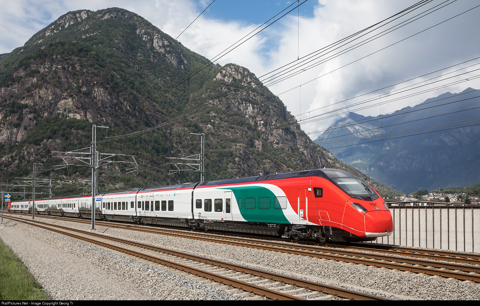 In the coming weeks, the "Giruno" high-speed train (StadlerRail designation SMILE) will have to undergo numerous tests in order to gain approval on the Italian network of Rete Ferroviaria Italiana (RFI). For this purpose the train RABe 501 # 004 was provided with a special paint scheme (foils). One head shows the colours of the Italian tricolour, the other the white Swiss cross on red. The intermediate cars advertise the future fast connection between Zurich and Milano Centrale. The train is glued with point symmetry on the other side, i.e. the head in front here shows the Swiss colours on the other side. The RABe 501 # 004 is on the way from Rorschach via the Gotthard Base Tunnel to Bellinzona, then to Italy, running on the line bypassing Biasca in the Ticino.