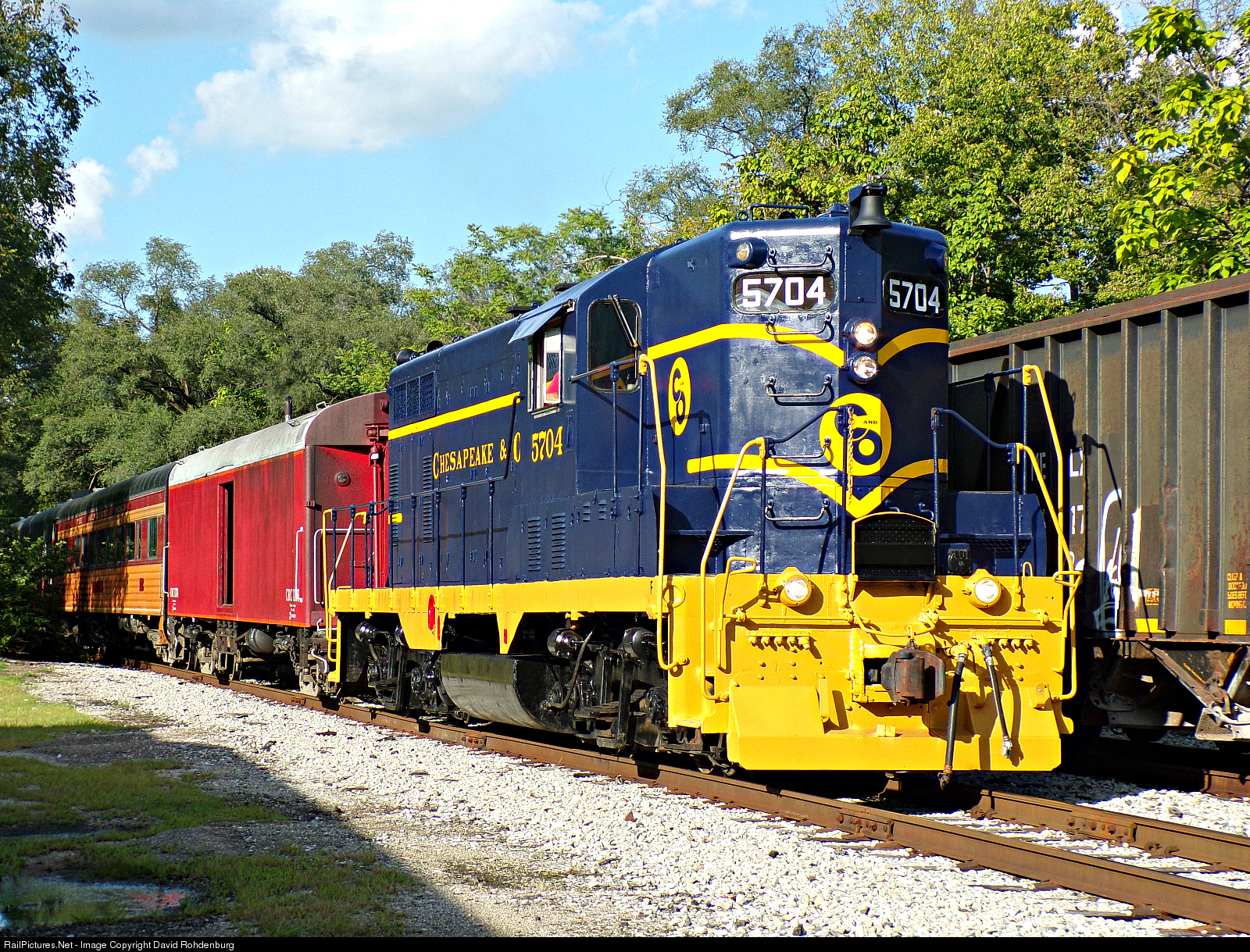 Looking good in a fresh coat of her as delivered C&O dress, and wearing her original road number for the first time since the 1980's, CRC GP7 5704 leads the annual Cincinnati Scenic Railway Labor Day Weekend Fireworks Train into the former PRR Undercliff Yard in Linwood on the I&O Oasis Subdivision, passing hopper cars set out for loading at Melvin Stone. Formerly CRC/LM&M 55, the 5704 was repainted into her original C&O colors by volunteers and staff of the Cincinnati Scenic Railway, the parent company of the LM&M Railroad and the Ohio Rail Experience excursion operation. To learn more about the CSR and their operations, please visit: https://www.cincinnatiscenicrailway.org