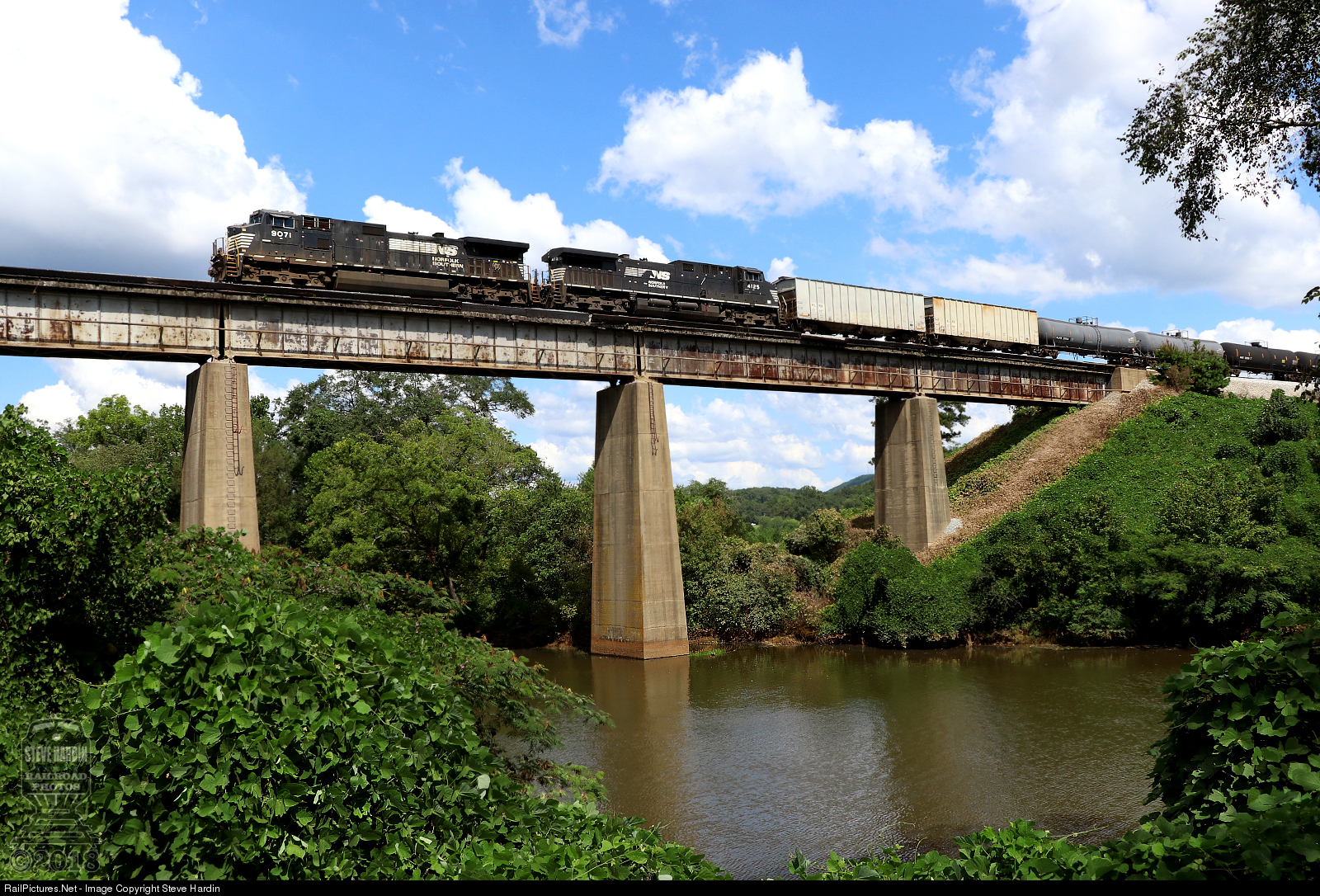 | After delivering it's load of ethanol to the plant in Florida, the Illinois bound ethanol train motors across the Etowah River with a pair of Norfolk Southern horses providing the power for it's competitor CSX. |
