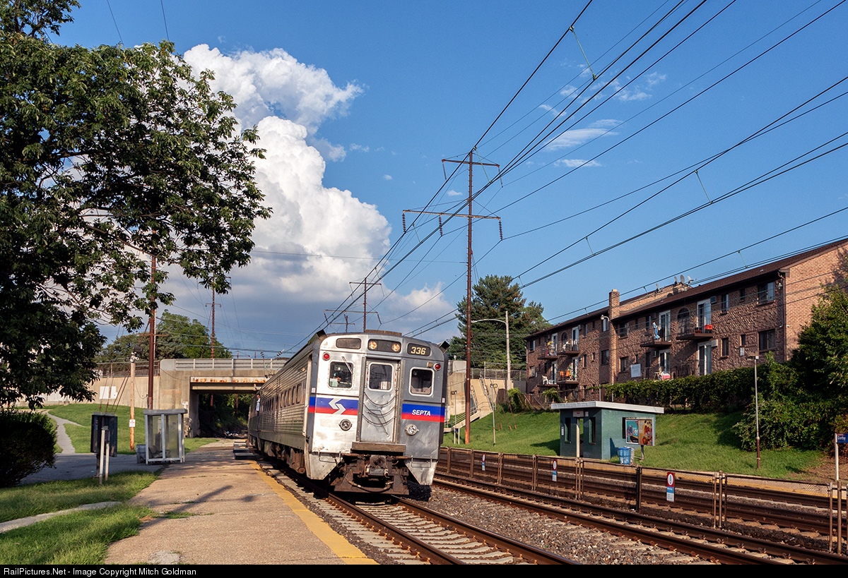 A late afternoon SEPTA commuter train makes a brief station stop at Darby some 6 miles south of Philadelphia, PA