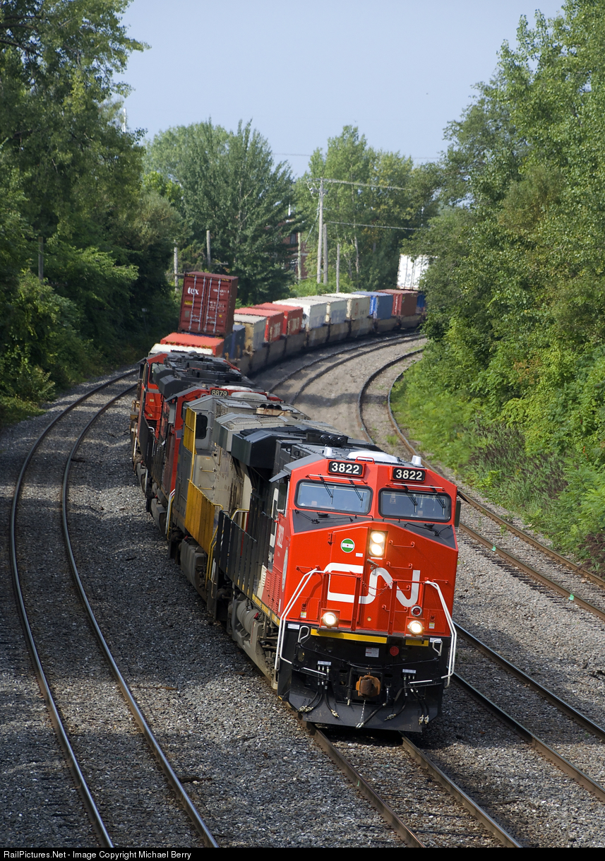 | Fresh GE leading. CN 3822 is nearly brand new as it leads Toronto-Halifax stack train CN 120, with CREX 1506, CN 8879 & CN 8916 trailing. |