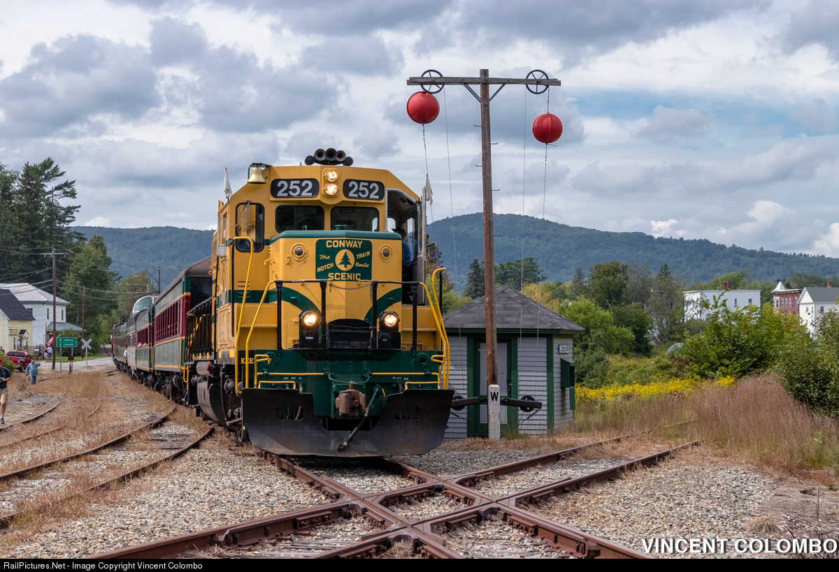 | Conway Scenic 252 proudly stands next to the famous ball signal where the Maine Central RR and Boston & Maine RR once intersected. 252 is a GP38 built for the Maine Central RR in 1966. Even though the train is on the former Boston & Maine trackage, it is an honor to have this workhorse in a place where it once roamed the rails in it's heyday, not to mention in a MEC-inspired paint scheme. Conway Scenic Railroad ran this special charter out of North Conway to Whitefield as a part of Railfan Weekend 2018. Conway Scenic claims this may be the last time they run to the diamond in order to focus on other projects. |