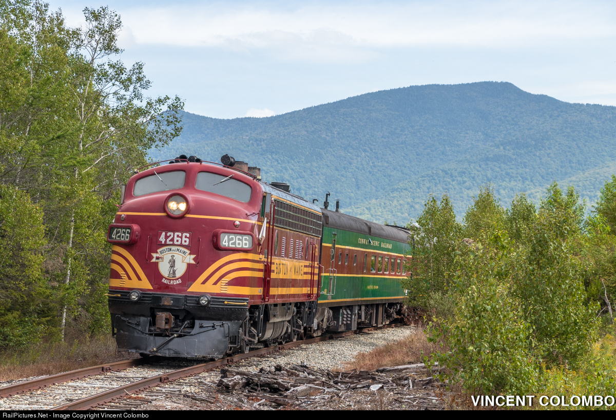 Ex- Boston and Maine 4266 brings up the markers on a special charter out of North Conway that brought passengers to the historic railroad diamond and ball signal at Whitefield. The train rounds the curve at Hazens and proceeds to hide behind the birch trees.