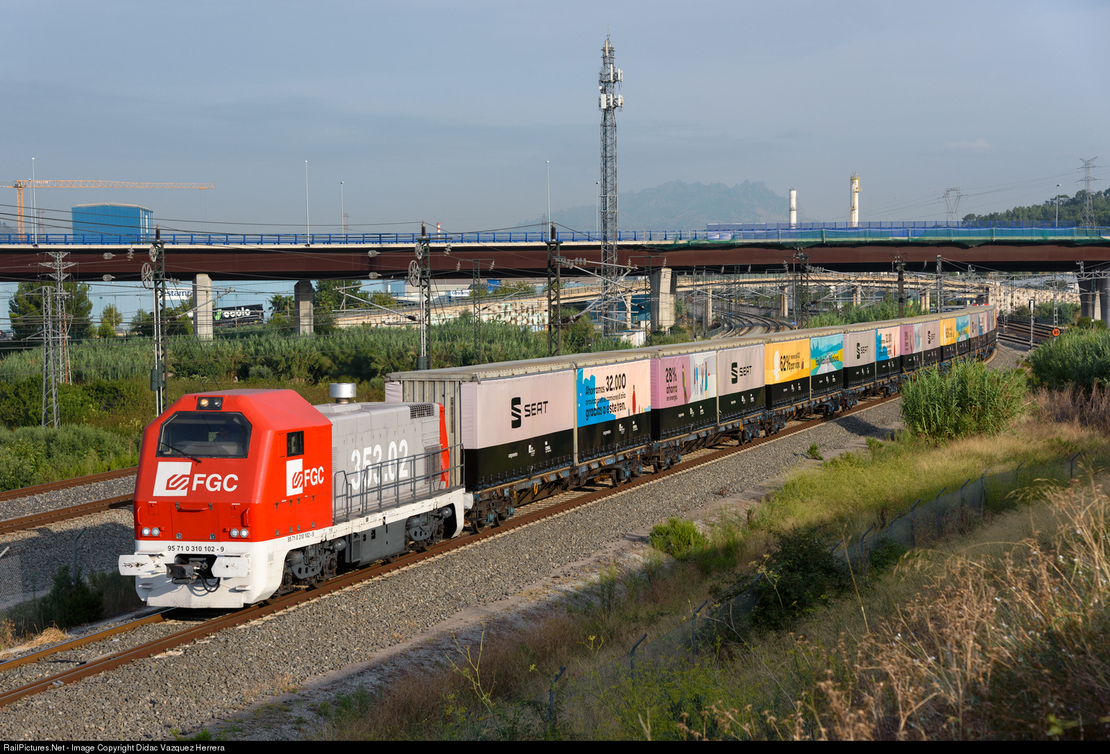 | Cargometro train between Factory of Seat at Martorell and the port of Barcelona, with 353.02/1 recently painted and new tarpaulins with publicity of the eficiency of this train. |