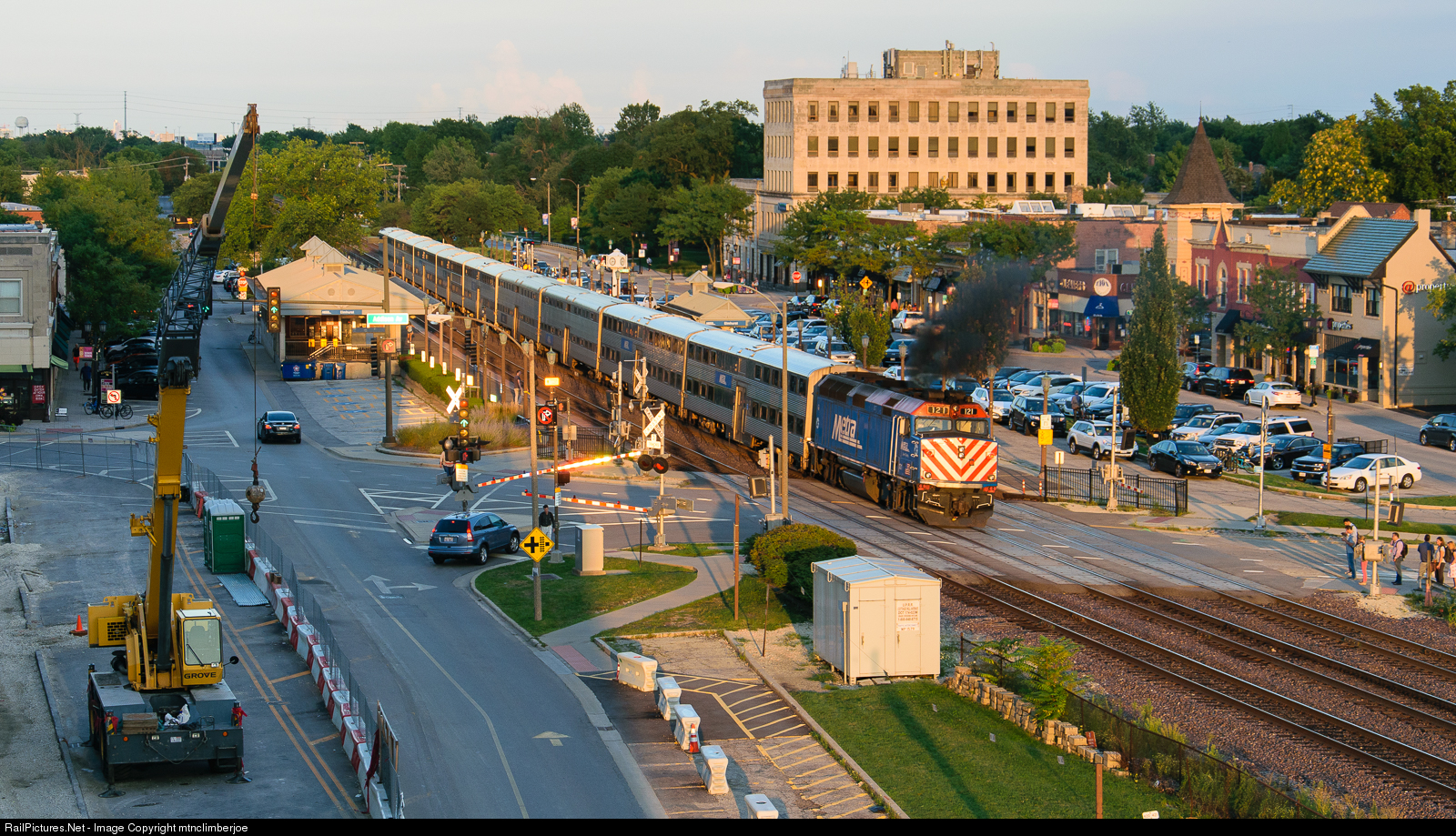 The last light of the day shines on an inbound Metra train as the F40 lets out a cloud of black smoke as it accelerates out of the station in the suburb of Elmhurst.