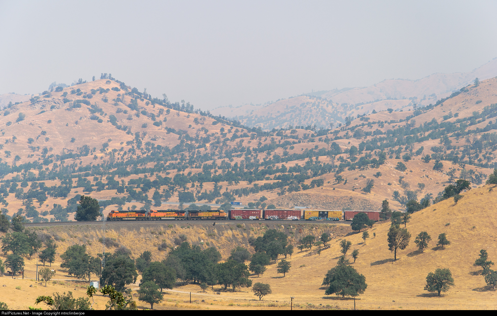 The air is thick with wildfire smoke, blocking out much of the view as a BNSF manifest freight roars upgrade at the famous Tehachapi Loop.