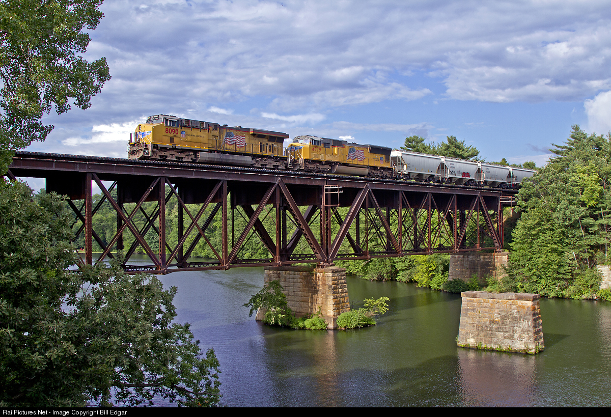 | UP 8090 and SD70M 4779 lead a westbound sand train over the Red Cedar River at Menomonie Jct., just north of Menomonie, WI on the former C&NW Twin Cities mainline. Note the older stone piers from the original single track bridge. The newer bridge was double track until 1963. |