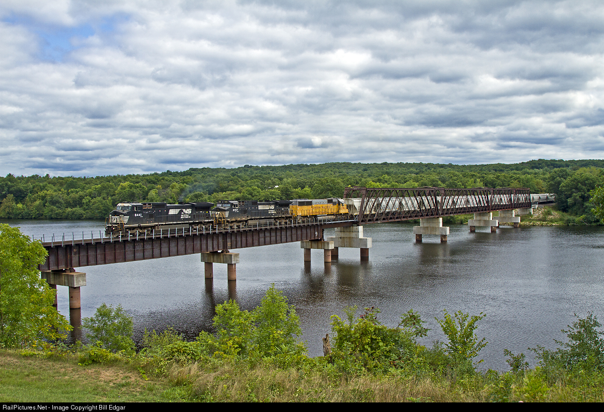 | Norfolk Southern 8441 and C44-9W 9727 head up a UP sand train rolling north on the former C&NW mainline to Duluth-Superior at Chippewa Falls, WI. The train will climb a short grade out of the valley and turn over the train to the Wisconsin Northern for handling with one or more of the silica sand operations between Chippewa Falls and Chetek, WI. |