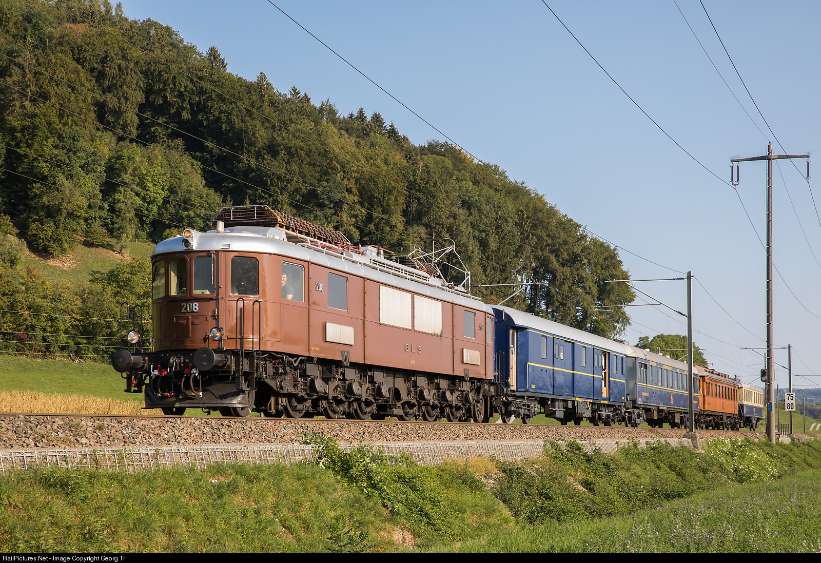 | Former BLS (Bern-Lötschberg-Simplon) locomotive Ae 6/8 # 208, built in 1943 by SLM and SAAS, now owned and operated by association Swisstrain, is pulling a train from Etzwilen via Schaffhausen-Bülach-Zürich Altstetten-Othmarsingen-Rotkreuz-Arth Goldau-Erstfeld to Airolo and back, between Eglisau and Glattfelden. The cars are all privately owned. |