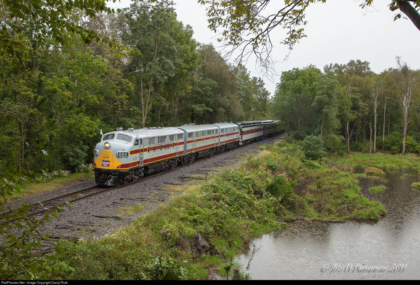 An A-B-A set of Lackawanna F3s lead a westbound passenger train past one of the many ponds along the Pocono Main on the way to Scranton, PA. The train is part of the annual ARHS Convention to celebrate their 70th anniversary of building built by EMD. The 2 A units were originally Bangor & Aroostook units built in 1948.